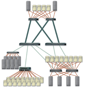 Slingshot's fabric support, 2Gb bandwidth, and port density provide you flexibility in choosing the SAN topology to deploy. The port count and bandwidth may allow a single switch to meet your connectivity needs. As your needs grow, you can efficiently scale your infrastructure by connecting to a Slingshot 4218 or director-class switch. When connecting to another 4210 or a Slingshot 4218, you can dynamically control bandwidth of trunks connecting switches by selecting how many ports to connect. The self-healing trunks automatically reroute data in the rare occurrence of a path failure (Figure 5).