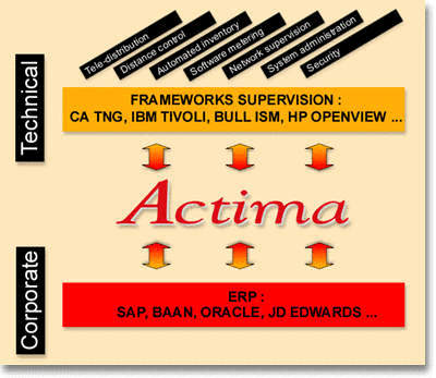 Actima gives you the choice of importing data which you need for your resource management, and dynamic links with the tables in which the data is stored (with the optional Actima Designer module).You can include in your computer resource management tool the data from your network and system administration tools, such as those from your company's general information systems (directories, etc.).